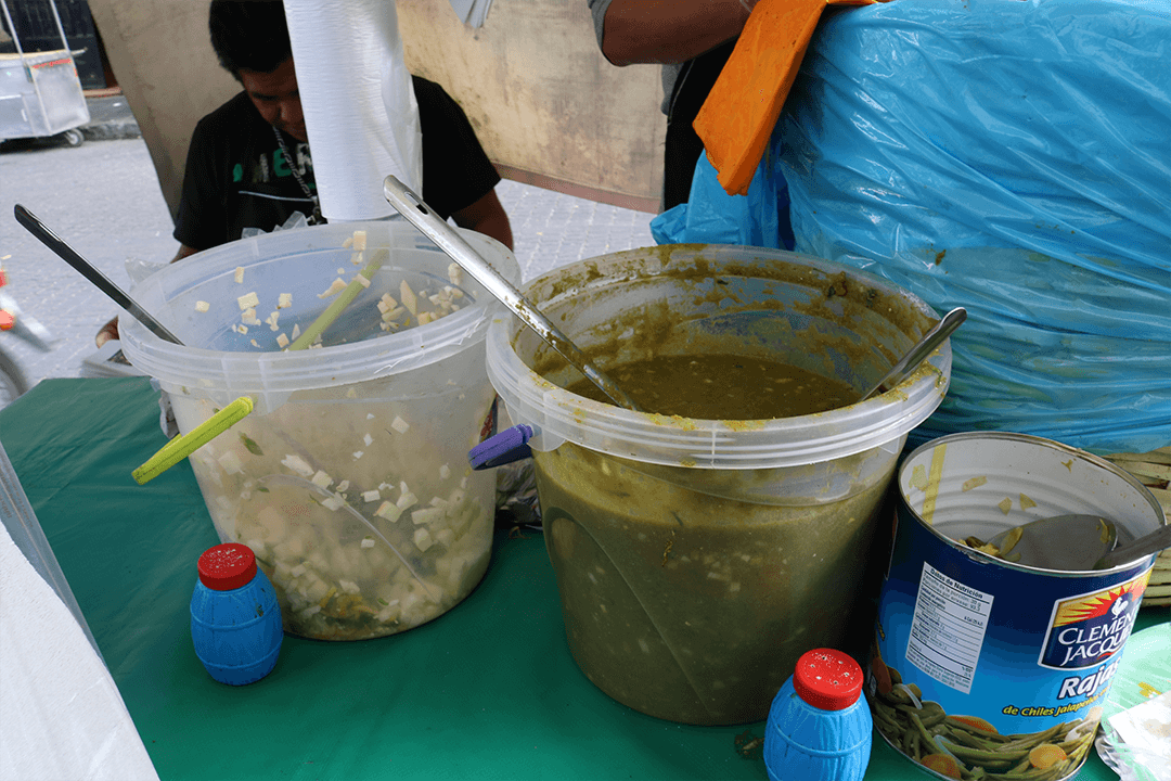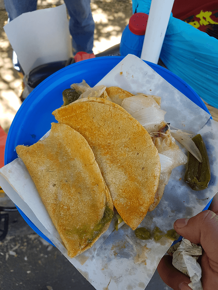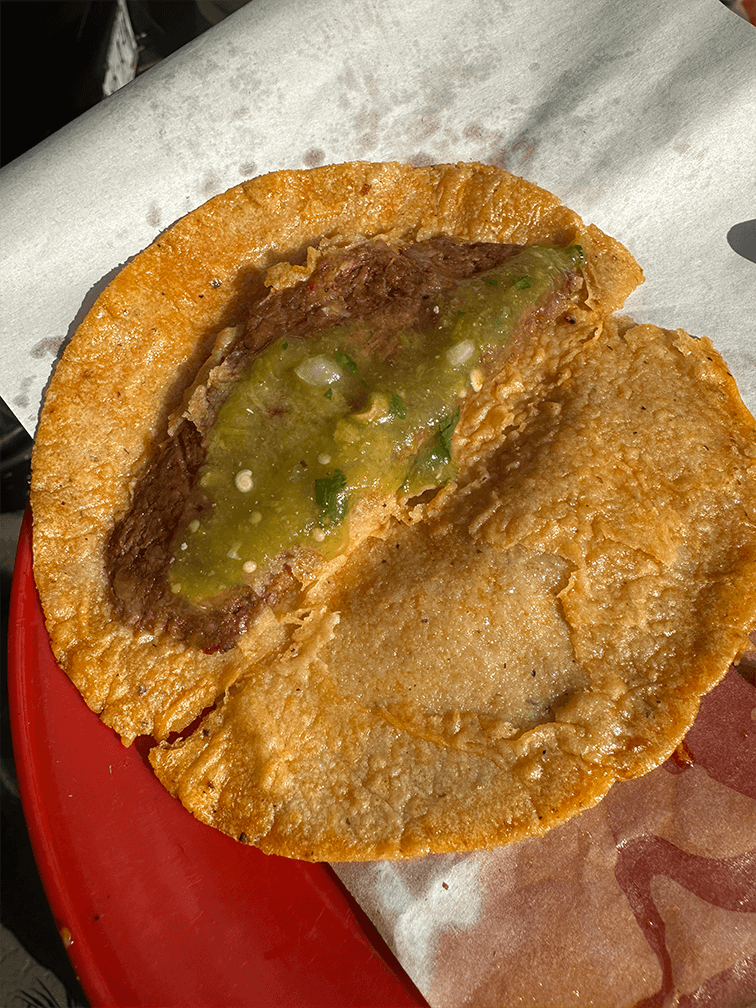 Y con un simple silbido puedes detener a un señor en bici para echarte dos órdenes, con esa salsa verde o roja repleta de cebolla cruda en cuadritos pequeños, que completa todo el viaje de sabor que juega en tu boca para decirte: